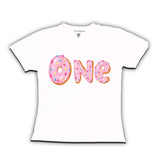 The t-shirt in the image is with the word "ONE" written in a pink sprinkled donut. .The cloth of t-shirts Bio wash 100% soft Cotton ,180 GSM, Combed yarn.The t-shirt is a fun and casual piece of clothing that can be worn for a variety of occasions. It would be a great choice for a day out with friends, a casual night out, or even a laid-back work environment. The t-shirt can be paired with jeans, shorts, or skirts