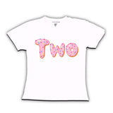 The t-shirt in the image is with the word "TWO" written in a pink sprinkled donut. .The cloth of t-shirts Bio wash 100% soft Cotton ,180 GSM, Combed yarn.The t-shirt is a fun and casual piece of clothing that can be worn for a variety of occasions. It would be a great choice for a day out with friends, a casual night out, or even a laid-back work environment. The t-shirt can be paired with jeans, shorts, or skirts