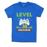 The "Level 38 Unlocked" design t-shirt is a popular choice for gamers of all ages. It is a simple, yet stylish design that features the words "Level 38 Unlocked" in a bold font