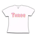 The t-shirt in the image is with the word "THREE" written in a pink sprinkled donut. .The cloth of t-shirts Bio wash 100% soft Cotton ,180 GSM, Combed yarn.The t-shirt is a fun and casual piece of clothing that can be worn for a variety of occasions. It would be a great choice for a day out with friends, a casual night out, or even a laid-back work environment. The t-shirt can be paired with jeans, shorts, or skirts