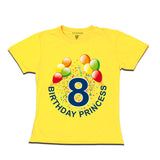 This adorable t-shirt is perfect for celebrating your princess birthday! It features a colorful print of a balloons,and the words "BIRTHDAY 8 PRINCESS". The t-shirt is made of a soft, comfortable material that will keep her cool on her special day. The print is bright and cheerful, and it will make her feel like a real princess.