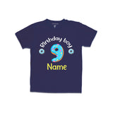 The t-shirt in the image is with the number "9" shaped like a donut. The text "Birthday boy" and the "Name" are also printed on the t-shirt. The t-shirt is made of 100% cotton.The t-shirt is a fun and casual piece of clothing that can be worn for a variety of occasions. It would be a great choice for a birthday party, a casual get-together, or even a day out with friends. The t-shirt can be paired with jeans, shorts, or skirts.