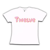 The t-shirt in the image is with the word "TWELVE" written in a pink sprinkled donut. .The cloth of t-shirts Bio wash 100% soft Cotton ,180 GSM, Combed yarn.The t-shirt is a fun and casual piece of clothing that can be worn for a variety of occasions. It would be a great choice for a day out with friends, a casual night out, or even a laid-back work environment. The t-shirt can be paired with jeans, shorts, or skirts