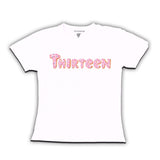 The t-shirt in the image is with the word "THIRTEEN" written in a pink sprinkled donut. .The cloth of t-shirts Bio wash 100% soft Cotton ,180 GSM, Combed yarn.The t-shirt is a fun and casual piece of clothing that can be worn for a variety of occasions. It would be a great choice for a day out with friends, a casual night out, or even a laid-back work environment. The t-shirt can be paired with jeans, shorts, or skirts