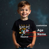 Blast Off! Get your personalized space rocket theme t-shirt for kids. Customize with your child's age and name for the perfect birthday or everyday wear. Ignite their imagination and let them reach for the stars with our unique designs.