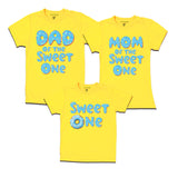 The first t-shirt has the words "DAD OF THE SWEET ONE" printed on it, the second t-shirt has the words "MOM OF THE SWEET ONE" printed on it, and the third t-shirt has the words "SWEET ONE" printed on it. The t-shirts are made by GFASHION and are made of 100% cotton.These t-shirts are a great way for parents and their child to show their love and support for each other. They can be worn on any occasion, but they would be especially appropriate for a birthday, holiday, or other special event