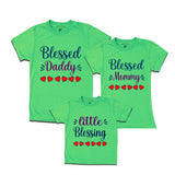 The t-shirts have the words "Blessed Daddy", "Blessed Mommy", and "Little Blessing" on them in different fonts. The t-shirts are from the brand GFASHION. These t-shirts are a great way for a family to show their love and appreciation for each other. They are also a fun and stylish way to match as a family.They are sure to be a hit with everyone in your family.