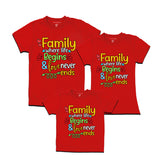 The phrase "Family where life begins and love never ends" is a popular sentiment that expresses the importance of family. It suggests that family is the foundation of life and that love is the glue that holds it together. This phrase can be a reminder of the importance of family and the love that we share with them.The t-shirt is a great way to show your family how much you love them. It is also a fun and unique way to celebrate a special occasion, such as a birthday or a holiday.The t-shirt is made from 100% cotton.
