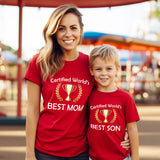 The mom's t-shirt says "Certified World's BEST Mom" and the Son's t-shirt says "Certified World's BEST Son". The t-shirts are from the brand GFASHION. These t-shirts are a great way for a family to show their love and appreciation for each other. They are also a fun and stylish way to match as a family. They are sure to be a hit with everyone in your family.