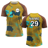 sports jersey with a brown and gold-yellow color scheme. The front and back feature a chaotic, abstract pattern of black dots, turquoise splashes, and dark blue blotches.