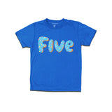 The t-shirt in the image is with the word "FIVE" written in a blue sprinkled donut. .The cloth of t-shirts Bio wash 100% soft Cotton ,180 GSM, Combed yarn.The t-shirt is a fun and casual piece of clothing that can be worn for a variety of occasions. It would be a great choice for a day out with friends, a casual night out, or even a laid-back work environment. The t-shirt can be paired with jeans, shorts, or skirts