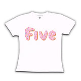 The t-shirt in the image is with the word "FIVE" written in a pink sprinkled donut. .The cloth of t-shirts Bio wash 100% soft Cotton ,180 GSM, Combed yarn.The t-shirt is a fun and casual piece of clothing that can be worn for a variety of occasions. It would be a great choice for a day out with friends, a casual night out, or even a laid-back work environment. The t-shirt can be paired with jeans, shorts, or skirts